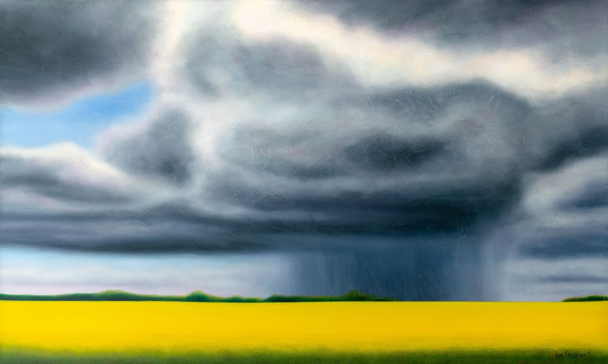 Along with his other painting "Under Hanging Cloud," this dramatic piece of art by Ian Sheldon is displayed in the Lineham Lobby. In the hotel spread, Sheldon has a total of five original paintings.