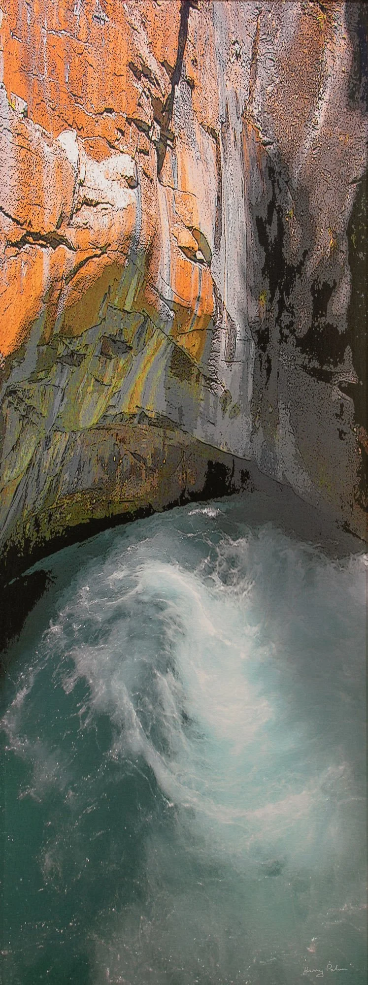 Harry Palmer was able to depict the hammering, swirling force of falling water and how it carves a bowl out of solid rock in this Tallpec work. Visit this artwork on the second level to get a closer look.